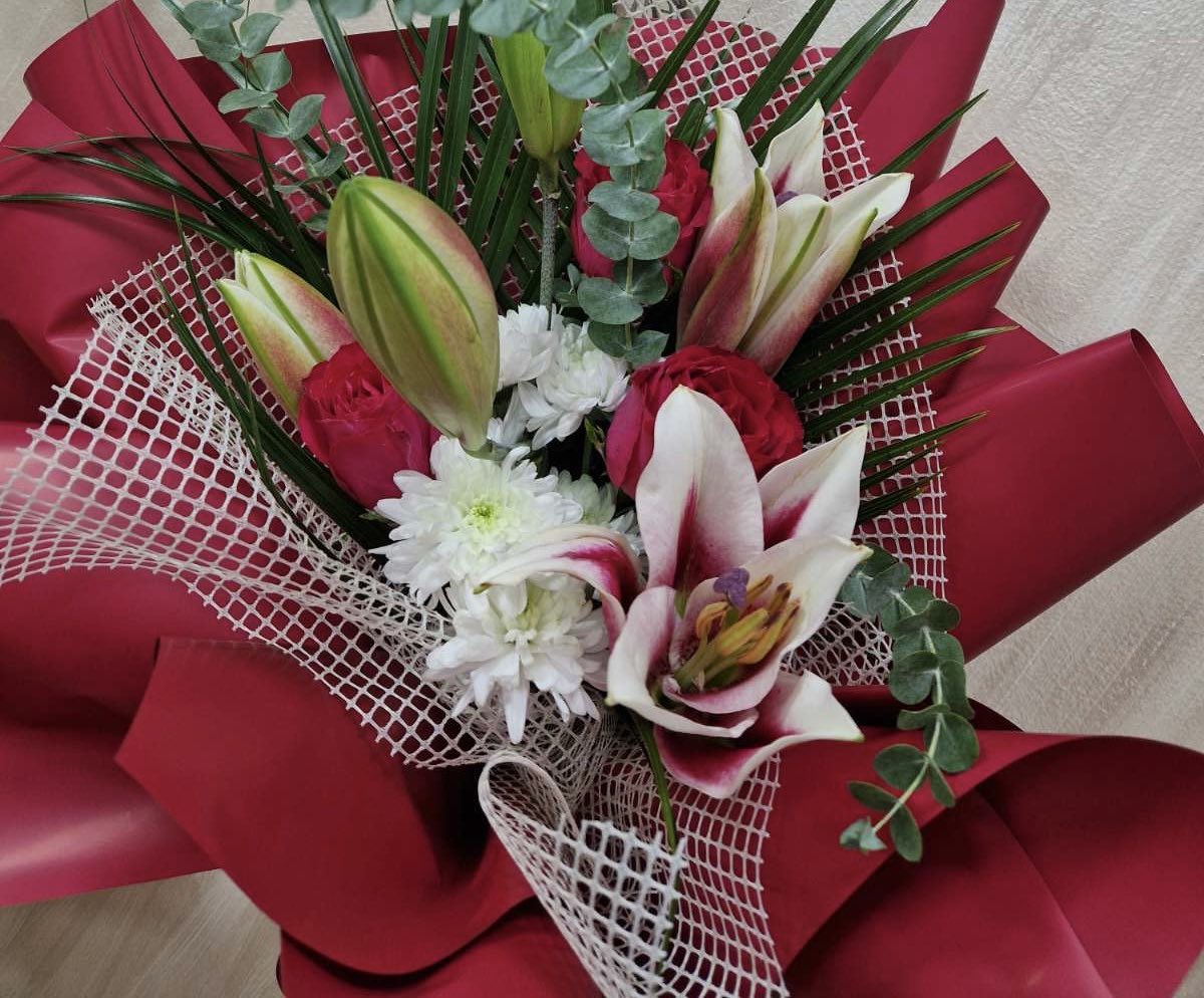Orijantal sa 3 ruže, hrizantemama, rubelinima i eukaliptusom